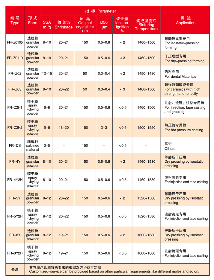 Product Description: We produce Y-PSZ powder by self-propagating hydrolysis process. Based on different content of Y2O3, we can produce different Y-PSZ powder. Normal products are 3Y-PSZ powder-based, divided into compacted powder and non-compacted powder depending on the customers’requirements. The physical properties could meet customers’different requirements for dry pressing, isostatic pressing, injection, casting, injection moulding, slip casting and so on.